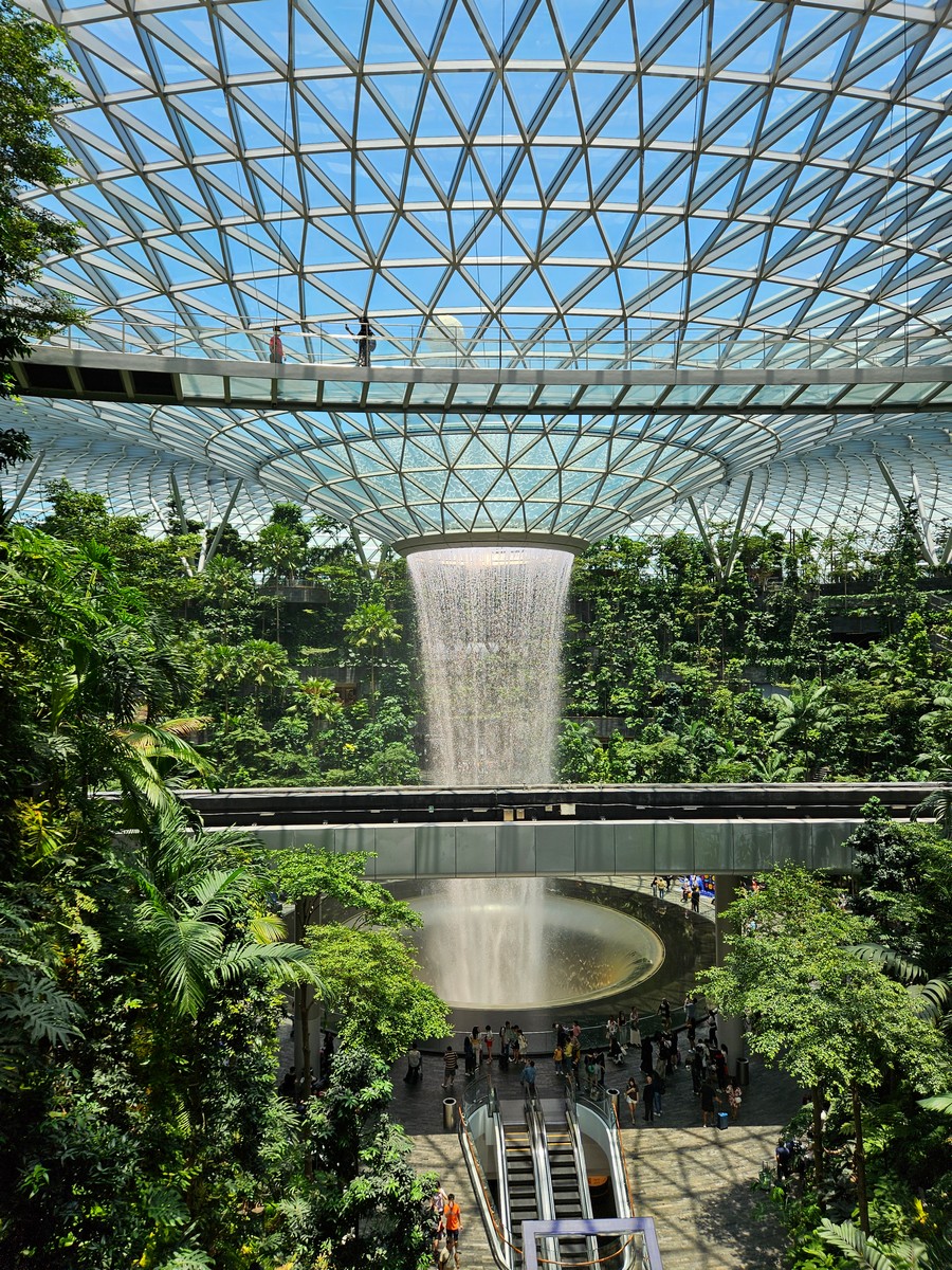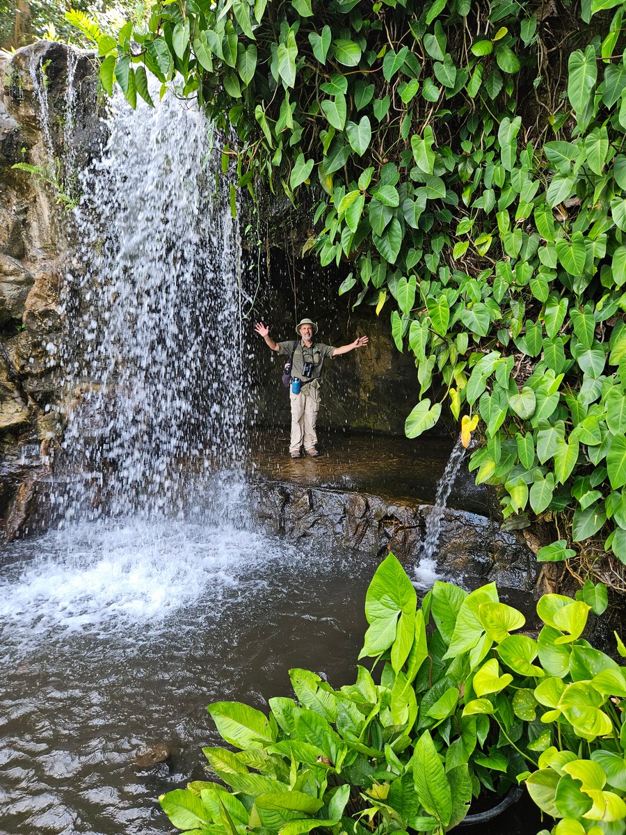 The next morning we went out to the Botanic Garden, our big chance to enjoy a public garden and see some local birds. Although we went early it warmed up and got steamy very quickly, so in no time we were soaked again. Still, a lovely garden to walk through for a few hours, enjoying the plants and birds. We thought we would take the MRT metro back to near the hotel, but they weren’t selling single tickets, and seemed like no point in getting a refillable card for one ride. But on a future visit, the system looks to be great for getting around. We came back up from the station to the street to find it raining hard… which it wasn’t only 5 minutes earlier! We used the local Uber (Grab) to get back to Jewel Changi shopping center at the airport.